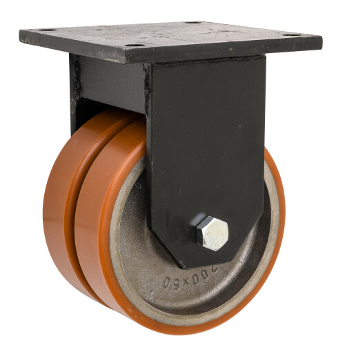 Roues jumelées à bandage polyuréthane 95 Sh A sur corps fonte.