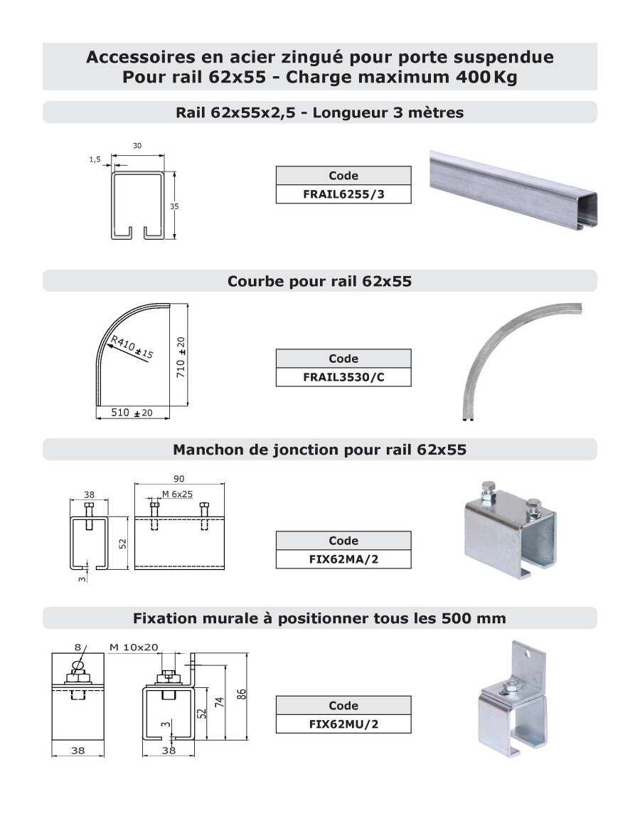 Accessoires acier pour porte suspendue intérieure. Fixation murale ou plafond pour rail 62x55. Poids total maximum de la porte 400 Kg avec chariots 4 roues acier. Montage facile et robuste.